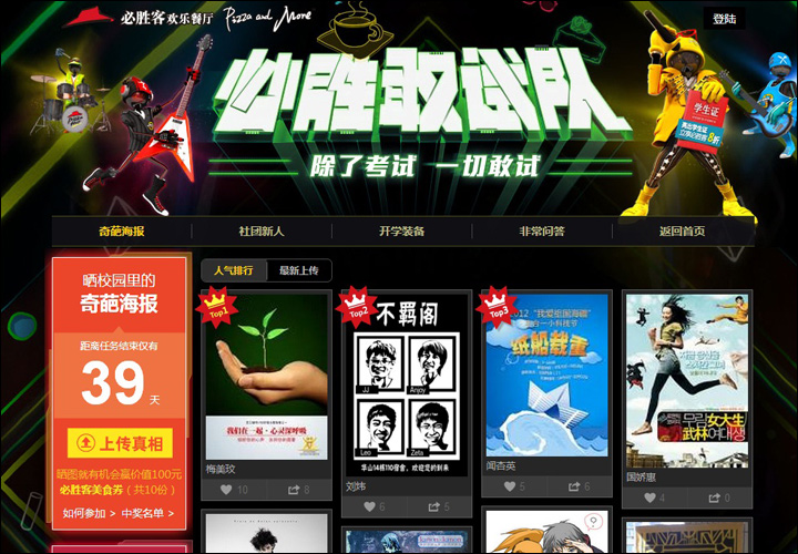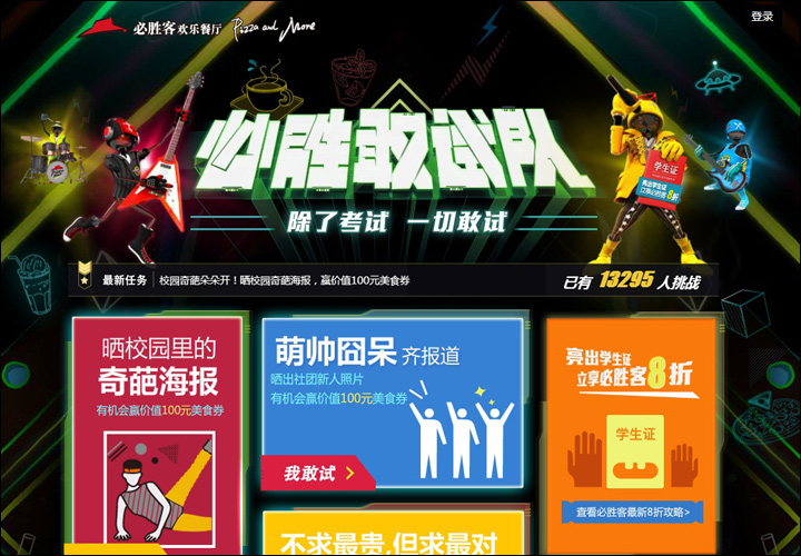 核心提示:必勝客敢試隊除了考試,一切敢試!曬校園里的奇葩海報,曬社團新人照片(萌帥呆囧),曬開學裝備,曬個人學生證,在這里沒有你想不到的,只有你不敢試的。參加活動,便有機會獲得必勝客美食券,鼓起勇氣,召喚小伙伴一起來試吧! Project: 必勝客敢試隊 人人網