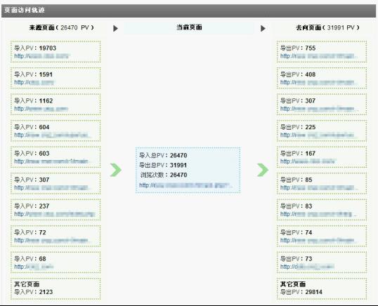訪客經(jīng)常在網(wǎng)站中的各個頁面之間跳轉(zhuǎn),訪問的路徑不勝枚舉,但可以通過觀察焦點(diǎn)頁面及其上下游頁面,掌握訪客的來路和去向,發(fā)現(xiàn)較普遍的訪客訪問習(xí)慣。頁面訪問軌跡即用來完成該功能,用戶可自由指定觀察焦點(diǎn)頁面,系統(tǒng)會列出該頁面的前十位來路頁面和去向頁面。對觀察焦點(diǎn)頁面而言,其自身的導(dǎo)入、導(dǎo)出PV的多少能夠反映出該頁面在網(wǎng)站的權(quán)重地位,而通過觀察來源和去向頁面又能最大限度的了解到訪客的行為習(xí)慣及興趣點(diǎn)。