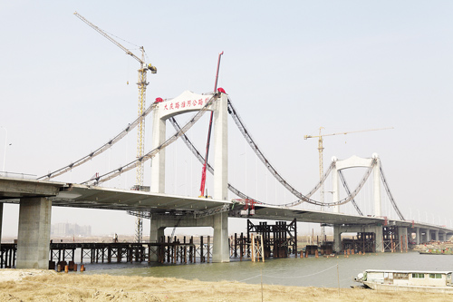 昨天上午,記者登上大慶路淮河公路橋主橋面時,熱鬧的施工現(xiàn)場與寒冷的天氣形成了鮮明的對比。大橋最南端的接線上,幾臺機(jī)器正在攤鋪最后一層瀝青。大慶路淮河公路橋建設(shè)指揮部技術(shù)質(zhì)量部部長薛峰告訴記者,橋面瀝青一天之內(nèi)就能鋪好。“瀝青是最后一道主要工序,完成后就標(biāo)志大橋主體大功告成了。”